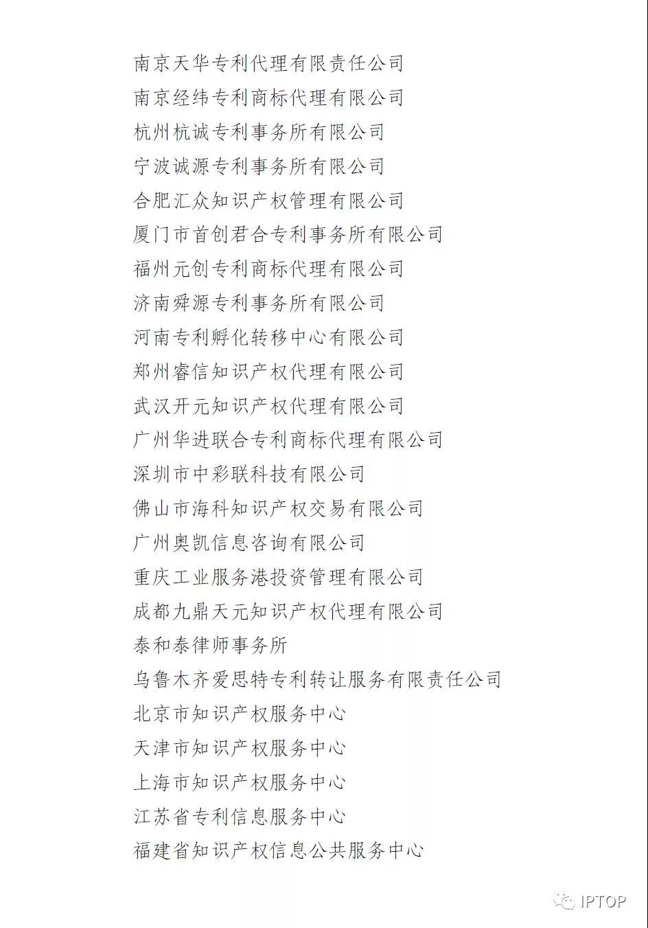 北京知产宝网络科技发展有限公司 北京知识产权运营管理有限公司 北京集慧智佳知识产权管理咨询股份有限公司 北京林达刘知识产权代理事务所(普通合伙) 中国商标专利事务所有限公司 中宇恒泰(北京)地理标志科技有限公司 九州海原科技(北京)有限公司 天津市北洋有限责任专利代理事务所 天津市天元生产力促进有限公司 石家庄众志华清知识产权事务所(特殊普通合伙) 河北国维知识产权咨询有限公司 太原晋科知识产权代理事务所(特殊普通合伙) 沈阳科苑专利商标代理有限公司 长春吉大专利代理有限责任公司 吉林新发知识产权服务有限公司 哈尔滨龙科专利代理有限公司 哈尔滨市伟晨专利代理事务所(普通合伙) 上海市协力律师事务所 上海晨皓知识产权代理事务所(普通合伙) 上海容智知识产权代理有限公司 上海弼兴律师事务所 上海硕力知识产权代理事务所(普通合伙) 南京苏高专利商标事务所(普通合伙) 江苏畅远信息科技有限公司 苏州创元专利商标事务所有限公司 苏州独墅湖科教发展有限公司 杭州天勤知识产权代理有限公司 杭州千克知识产权代理有限公司 合肥市长远专利代理事务所(普通合伙) 合肥智慧龙图腾知识产权股份有限公司 芜湖安汇知识产权代理有限公司 安徽浩智信知识产权代理有限公司 厦门市新华专利商标代理有限公司 江西省子轩科技有限公司 江西清能高科技术有限公司 济南诚智商标专利事务所有限公司 青岛橡胶谷知识产权有限公司 青岛华慧泽知识产权代理有限公司 河南省亿通知识产权服务有限公司 武汉科皓知识产权代理事务所(特殊普通合伙) 长沙朕扬知识产权代理事务所(普通合伙) 东莞市华南专利商标事务所有限公司 广州新诺专利商标事务所有限公司 深圳市中兴达知识产权运营有限公司 广西南宁新创之友知识产权代理有限公司 海口汉普知识产权代理有限公司 重庆强大凯创专利代理事务所(普通合伙) 超凡知识产权服务股份有限公司 四川睿道知识产权服务有限公司 行之知识产权服务集团有限公司 遵义强大博信知识产权服务有限公司 贵阳东圣专利商标事务有限公司 云南滇创科技孵化器企业管理有限公司 陕西丰瑞律师事务所 新疆知信科技有限公司