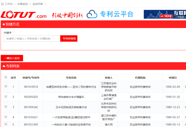 买专利卖专利找龙图腾,真高效! 查专利查商标用IPTOP,全免费!专利年费监控用IP管家,真方便! 点击监控列表,进入监控列表页面。