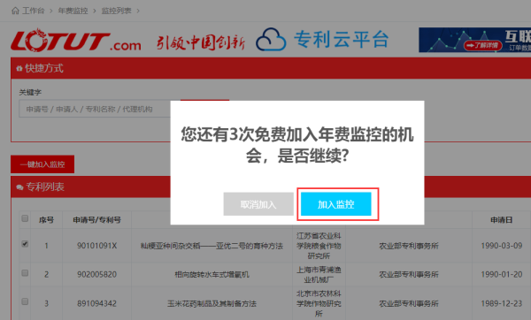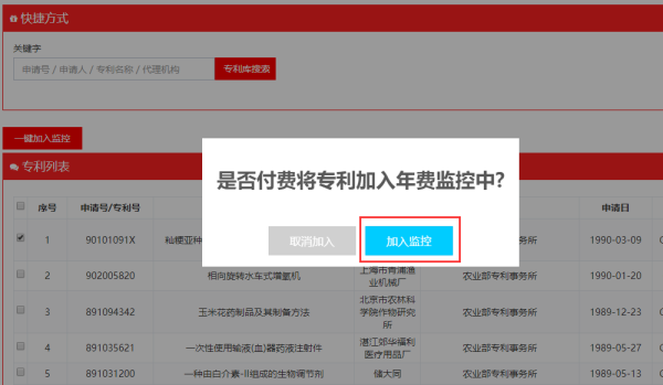 在搜索结果页面,选择专利,点击一键加入监控按钮。免费条数使用完毕,页面提示是否付费将专利加入年费监控中。