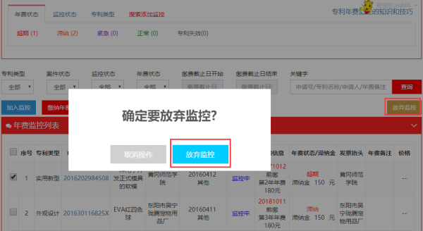 1.6修改年费备注 在监控列表栏目,选择需要修改年费备注的专利,点击修改年费备注按钮,在弹框中输入要修改后的内容,确认后即修改成功。 1.7 修改发票抬头 在监控列表栏目,选择需要修改发票抬头的专利,点击修改发票抬头按钮,在弹框中输入要修改后的内容,确认后即修改成功。 1.8 表格导出 在监控列表栏目,选择需要导出表格的专利,点击表格导出按钮,导出excel表格。 1.9 放弃监控 在监控列表栏目,选择监控中或者未监控的专利,点击放弃监控按钮,页面提示放弃监控成功。