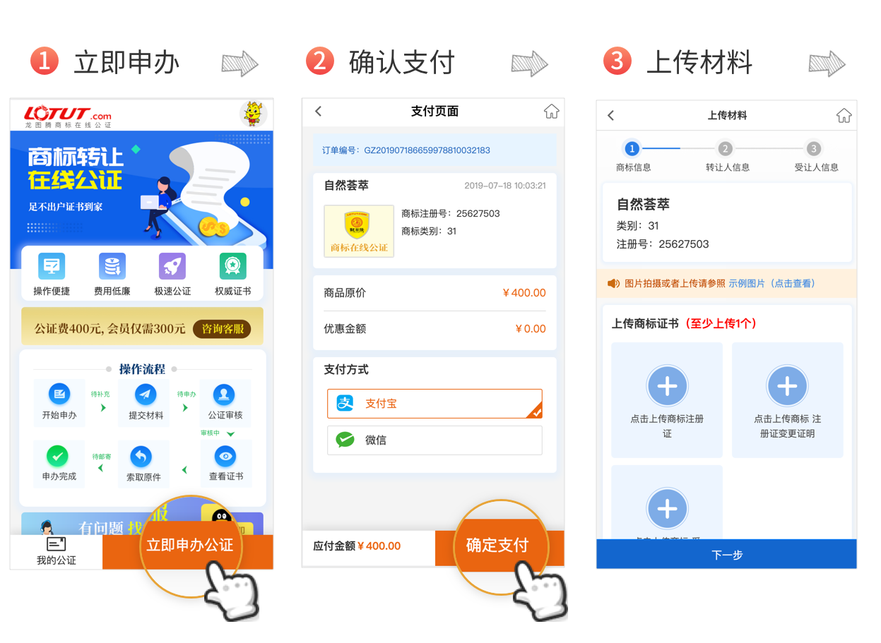 2.商标在线公证优势 费用低 →公证费用低,龙图腾会员更享300/件超低价格 速度快 →足不出户,10分钟即可完成商标在线公证申请 操作便捷 →全程线上操作,进度随时可查、客服全程指导