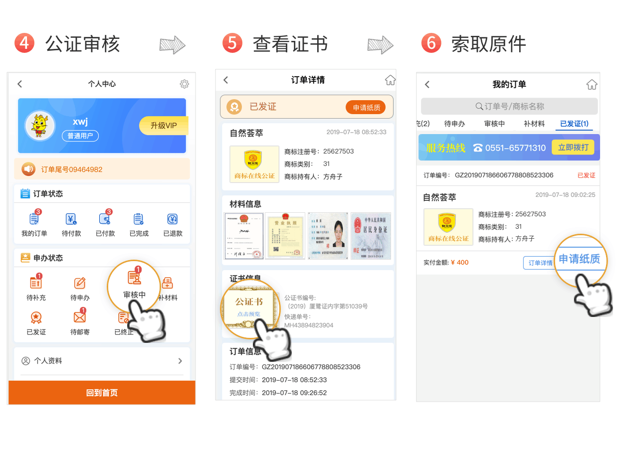 4.商标如何在线公证? 进入龙图腾商标在线公证系统,注册登录后(可用龙图腾管家账号直接登录),按下图所示的操作流程进行操作,即可完成商标在线公证申办。在线办理过程中如有任何疑问,可联系在线客服,全程为您指导~~