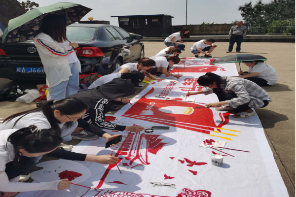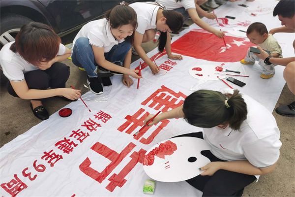 今天是连日雨季中,难得阳光明媚的一天,但是在这种夏日三伏的天气里,上午的阳光还是让小伙伴们感受到了灼热感,但是在山上,找不到遮阳的地方,作画的占地空间又比较大,每个人都暴露在太阳下,但是即使是这样,为了顺利完成画卷,保证团建如期完成,小伙伴们依然扬着笑容,一起作画,画出祖国的美丽河山、长城、天安门、国旗、八一军徽,谁都没有掉队,没有妥协。最终,经过小伙伴们认真细致的协作,画卷经过半天的努力,终于完成了,成品的效果,让山上的行人都加以称赞,甚至有的人开玩笑说,感觉像打印出来的。大家也是感觉到自己的努力没有白费,为此次活动的圆满完成都付出了一份汗水。
