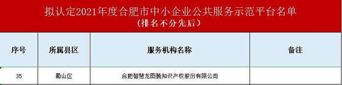 近日,合肥市经济和信息化局公示了2021年度合肥市中小企业公共服务示范平台名单,凭借扎实的服务内容和优秀的服务成果,合肥智慧龙图腾知识产权股份有限公司获此殊荣!