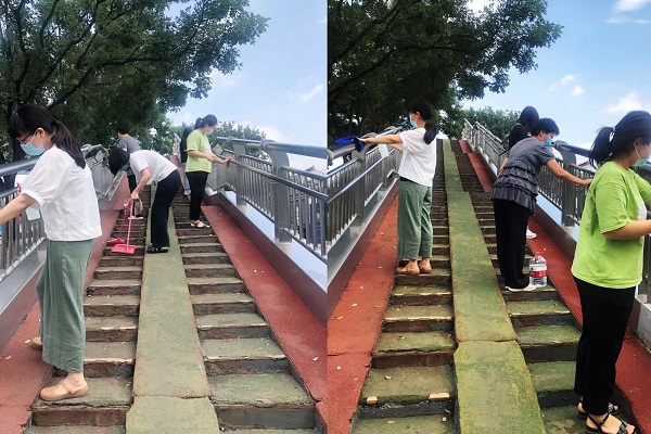 大家带着提前准备好的消毒液和抹布等工具来到公司附近的一座天桥,小伙伴们纷纷动手有的为天桥消毒清洁,有的为天桥扫清落叶和垃圾,大家热情高涨不放过任何一个角落,每个人尽自己的绵薄之力打扫着天桥,大家的齐心协力让这个团体愈发强大,最后在我们的辛勤劳动下,天桥焕然一新。