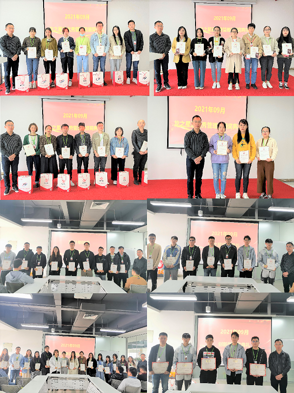 随后,获奖的龙之星纷纷发表了获奖感言,大家在表示感谢公司给予的荣誉和奖励的同时,希望可以继续努力,继续获奖,再创佳绩。 紧接着刘总为获得龙图腾公司9月份优秀管理奖及创新奖的人员颁发荣誉证书及奖品,并合影留念。
