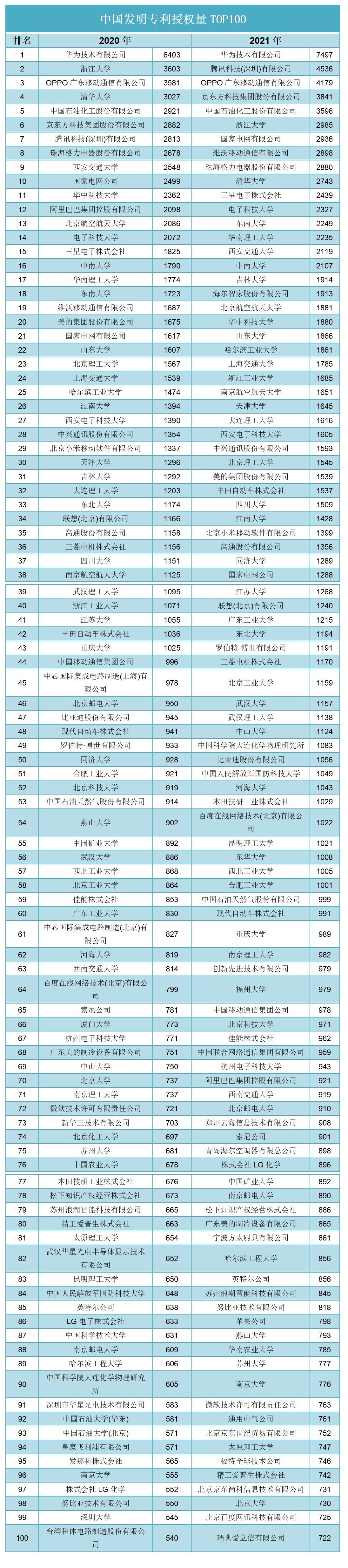 买专利卖专利找龙图腾,真高效! 查专利查商标用IPTOP,全免费!专利年费监控用IP管家,真方便! 2021年中国发明专利授权量排名出炉啦!通过IPTOP知识产权平台的专利地图栏目获取到,2021年排名前10的专利权利人依次为华为技术有限公司、腾讯科技(深圳)有限公司、OPPO广东移动通信有限公司、京东方科技集团股份有限公司、中国石油化工股份有限公司、浙江大学、国家电网有限公司、维沃移动通信有限公司、珠海格力电器股份有限公司、清华大学。其中,华为再次霸占榜首;与2020年相比,仅有维沃移动通信有限公司一家取代了西安交通大学进入前10强,其他9名仅部分发生了名次变化。进入前10强的门槛从2499件提高到了2743件;进入前100强的门槛从540件提高到了722件。具体细节请见下表。