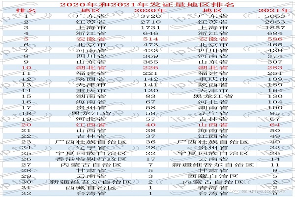 三、地区排名 截止至2021年12月31日,通过龙图腾IPTOP知识产权平台的集成电路栏目进行数据分析得到:累计发证量排名前五的地区依次为:1、广东省12171件,2、江苏省8789件,3、上海市8342件,4、北京市2734件,5、浙江省2685件;全国各地的具体的发证数据如下图所示。