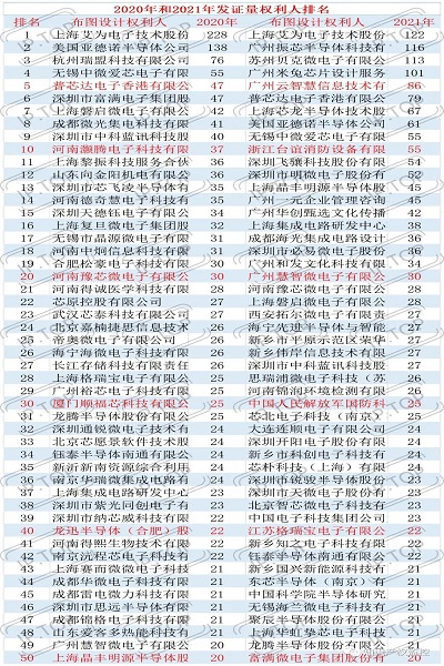 买专利卖专利找龙图腾,真高效! 查专利查商标用IPTOP,全免费!专利年费监控用IP管家,真方便! 2021年集成电路布图设计授权排名出炉啦!通过龙图腾IPTOP知识产权平台的集成电路栏目进行数据分析得到:2021年累计授权集成电路布图设计为13390件,较2020年累计授权的11727件增长较少。2021年排名前10的权利人依次为:1、上海艾为电子技术股份有限公司,2、广州振芯半导体科技有限公司,3、苏州贝克微电子有限公司,4、广州米兔芯片设计服务有限公司,5、广州云智慧信息技术有限公司,6、普芯达电子香港有限公司,7、上海芯龙半导体技术股份有限公司,8、美国亚德诺半导体公司,9、无锡中微爱芯电子有限公司,10、浙江台谊消防设备有限公司,与2020年相比,仅上海艾为电子技术股份有限公司维持了第1名,其他名次均发生了较大变化,第1名授权数量从228件下降到122件,下降超过了50%,进入前10的门槛从37件增长到55件,进入前100名的门槛未发生变化,仍为14件。 前100名的授权数据具体如下图所示。