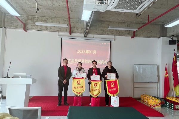 买专利卖专利找龙图腾,真高效! 查专利查商标用IPTOP,全免费!专利年费监控用IP管家,真方便! 为鼓励在工作中成绩优异、工作表现突出、辛勤努力的优秀员工及优秀团队,2月21日上午,龙图腾公司2022年01月份龙之星颁奖典礼分别在高新区和蜀山区办公室举行,公司董事长刘光、各部门负责人及全体员工参加了颁奖典礼。